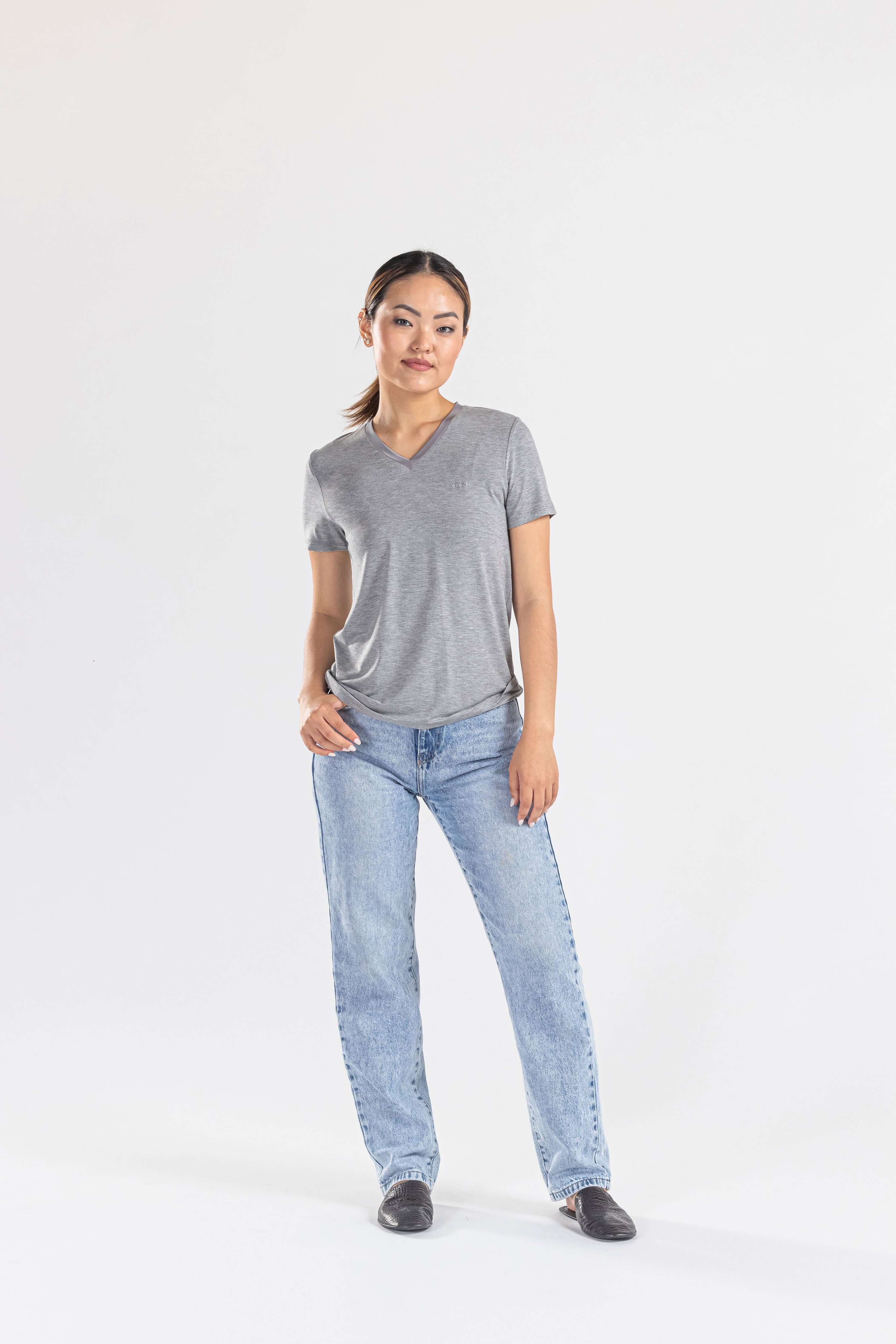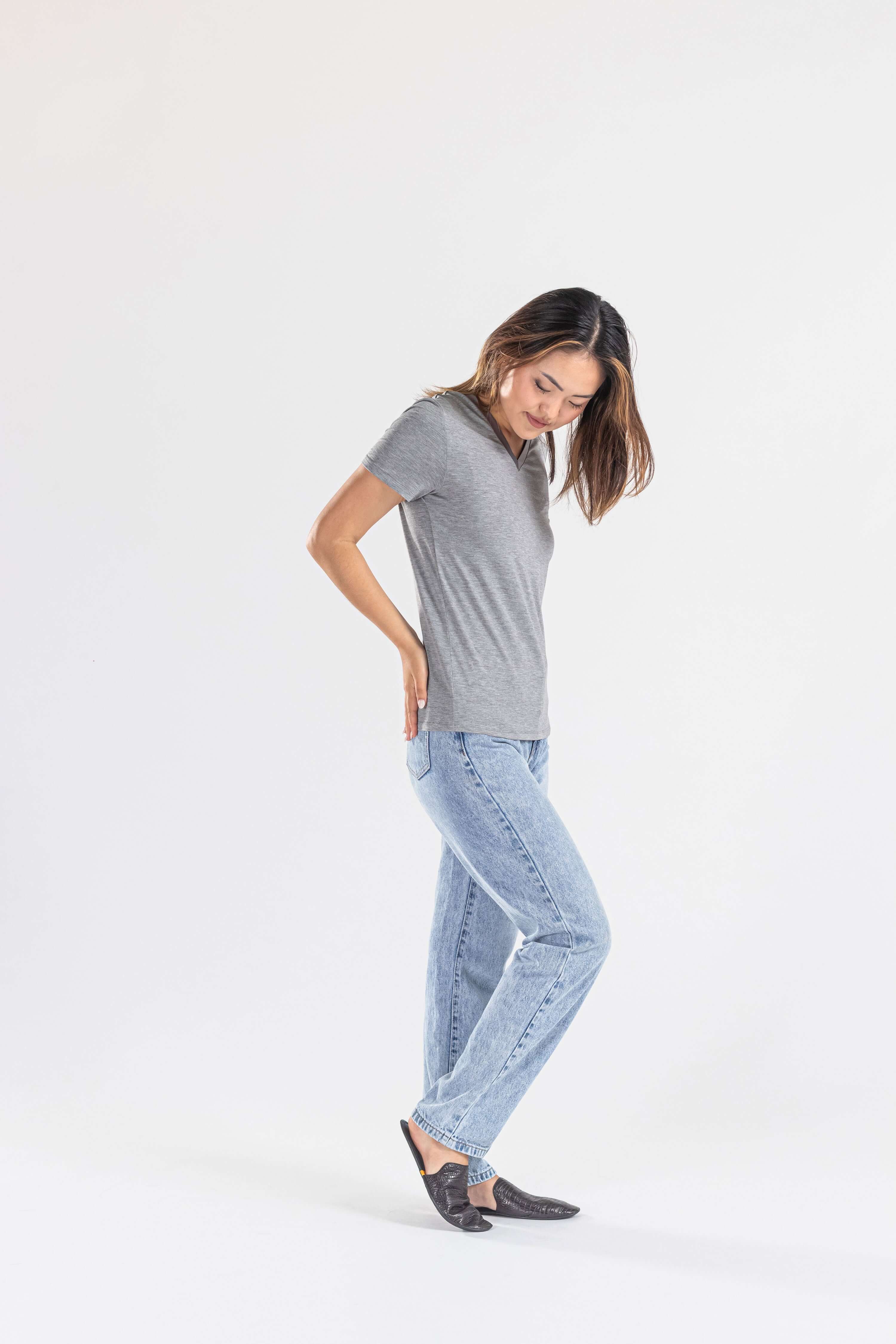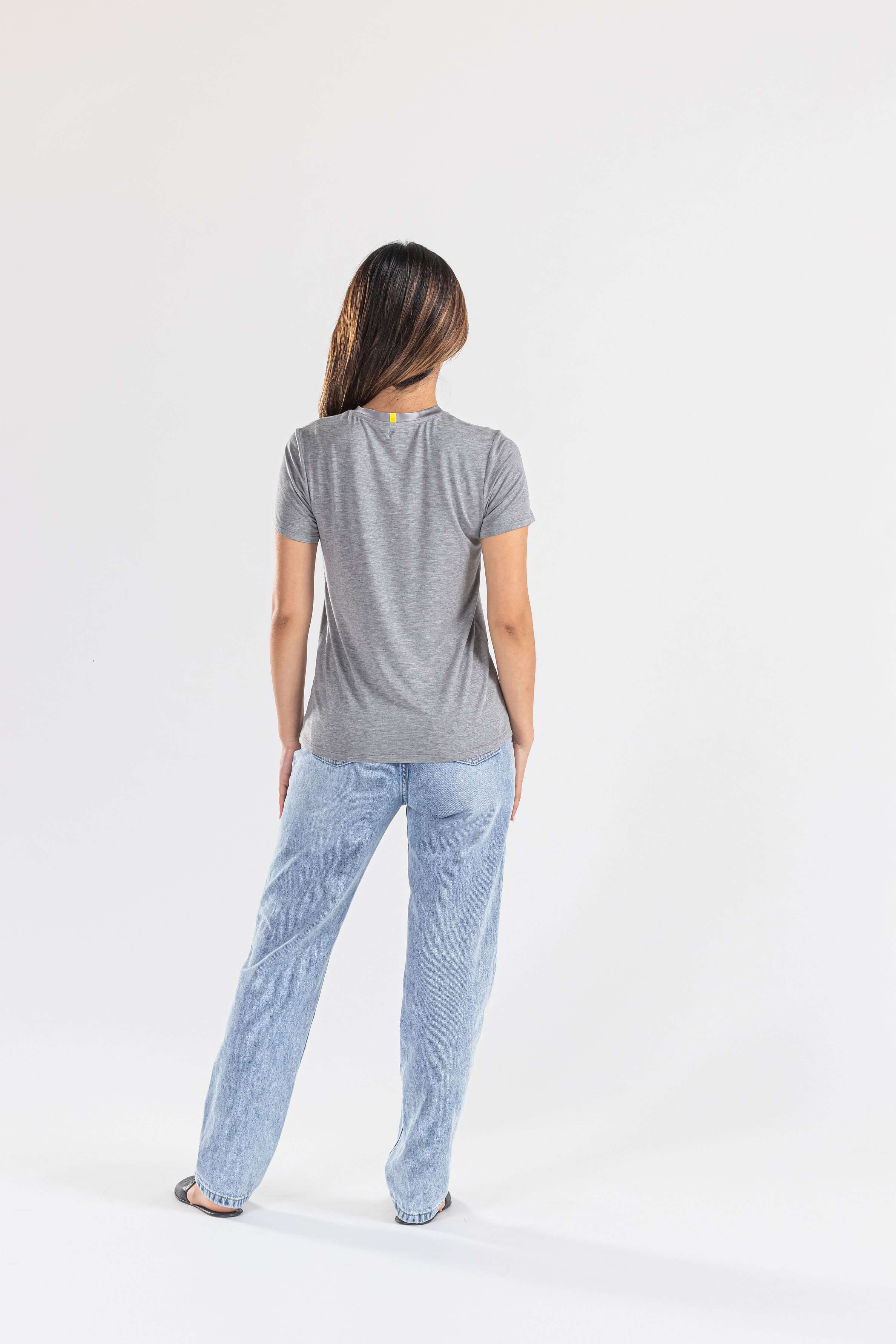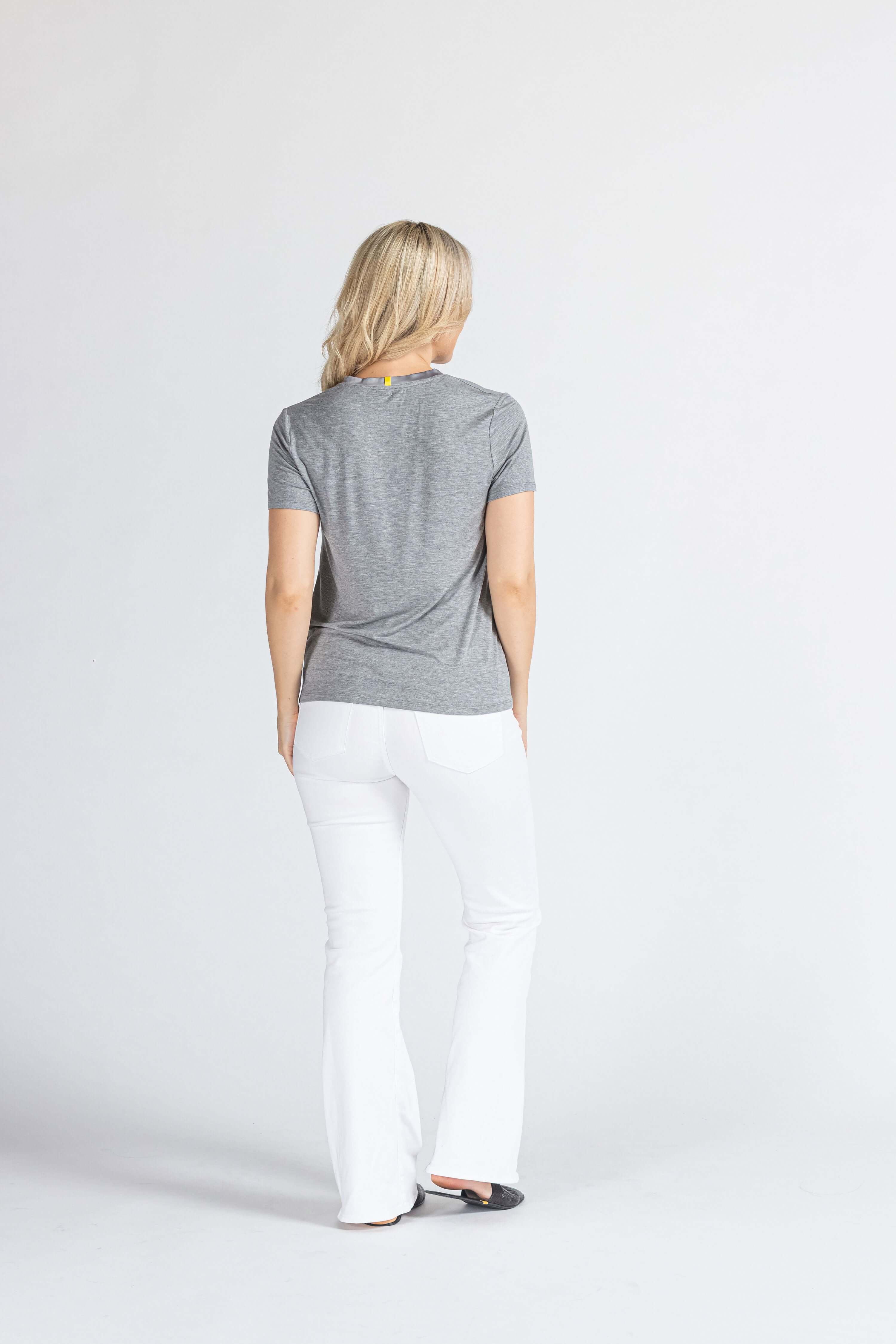 Jeg købte denne T-shirt i grå, og den er så blød og behagelig at have på, at jeg gik tilbage og også købte den hvide. Pasformen er virkelig flatterende, og silkedetaljen ved halsen er virkelig fin.