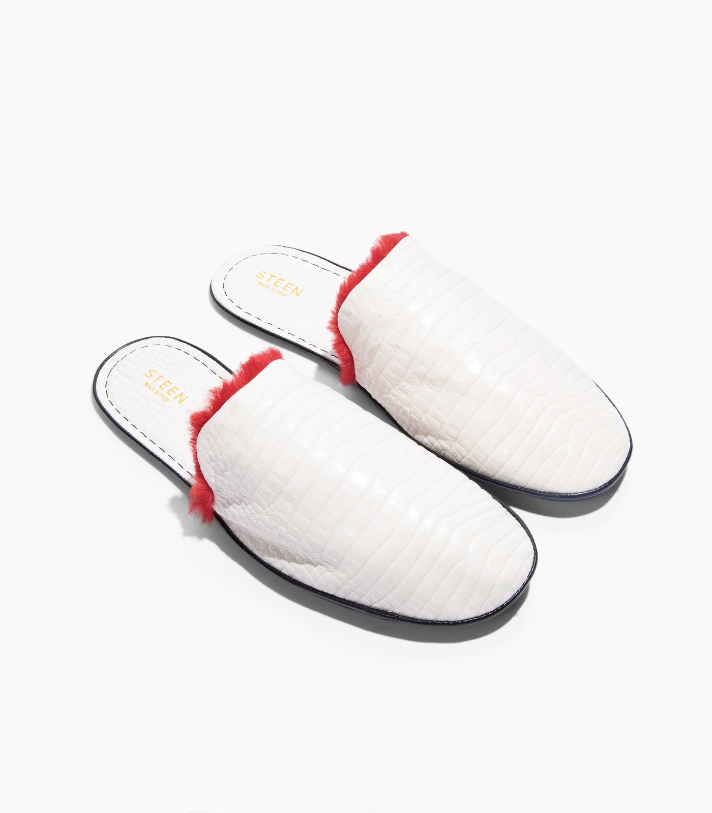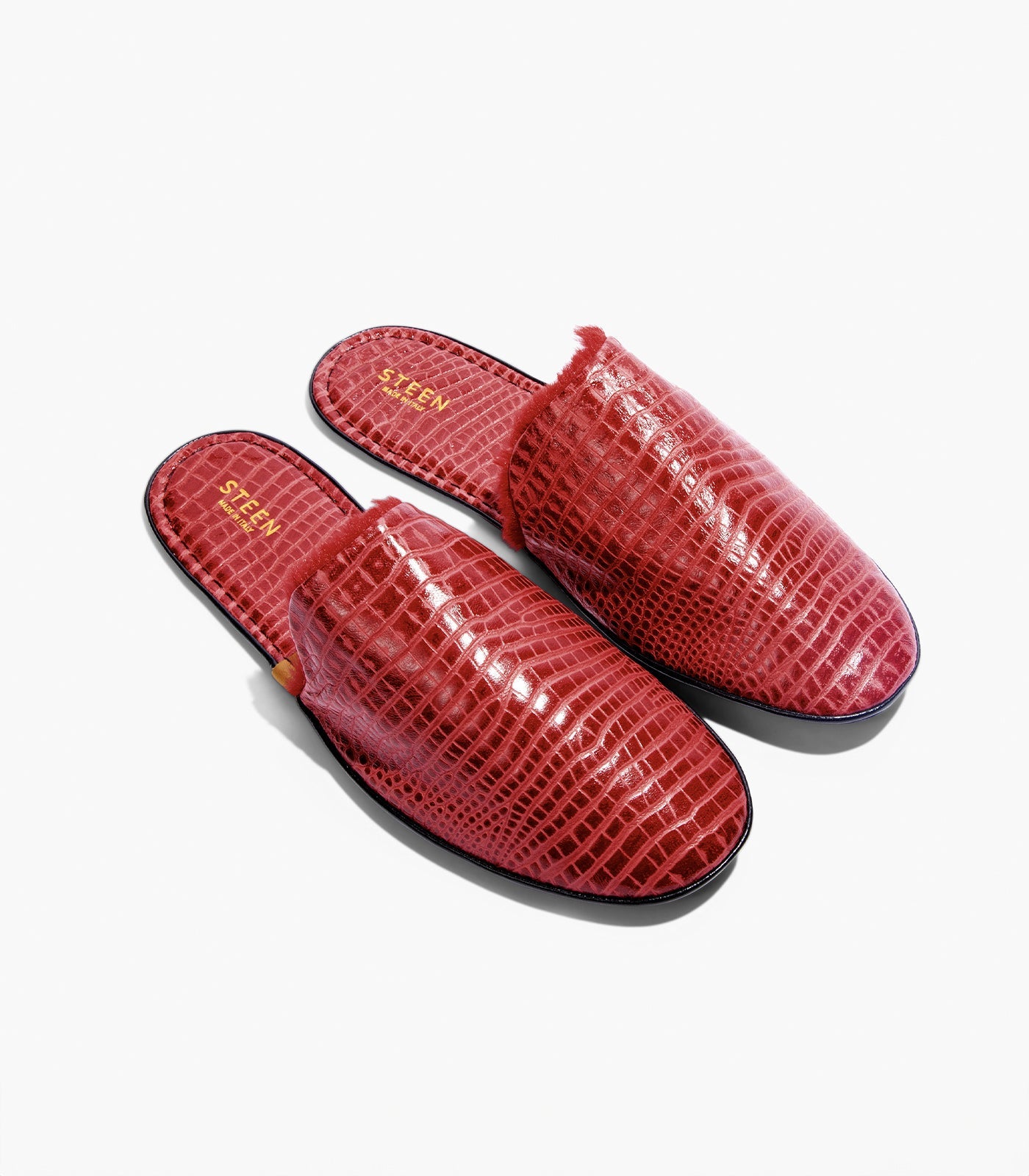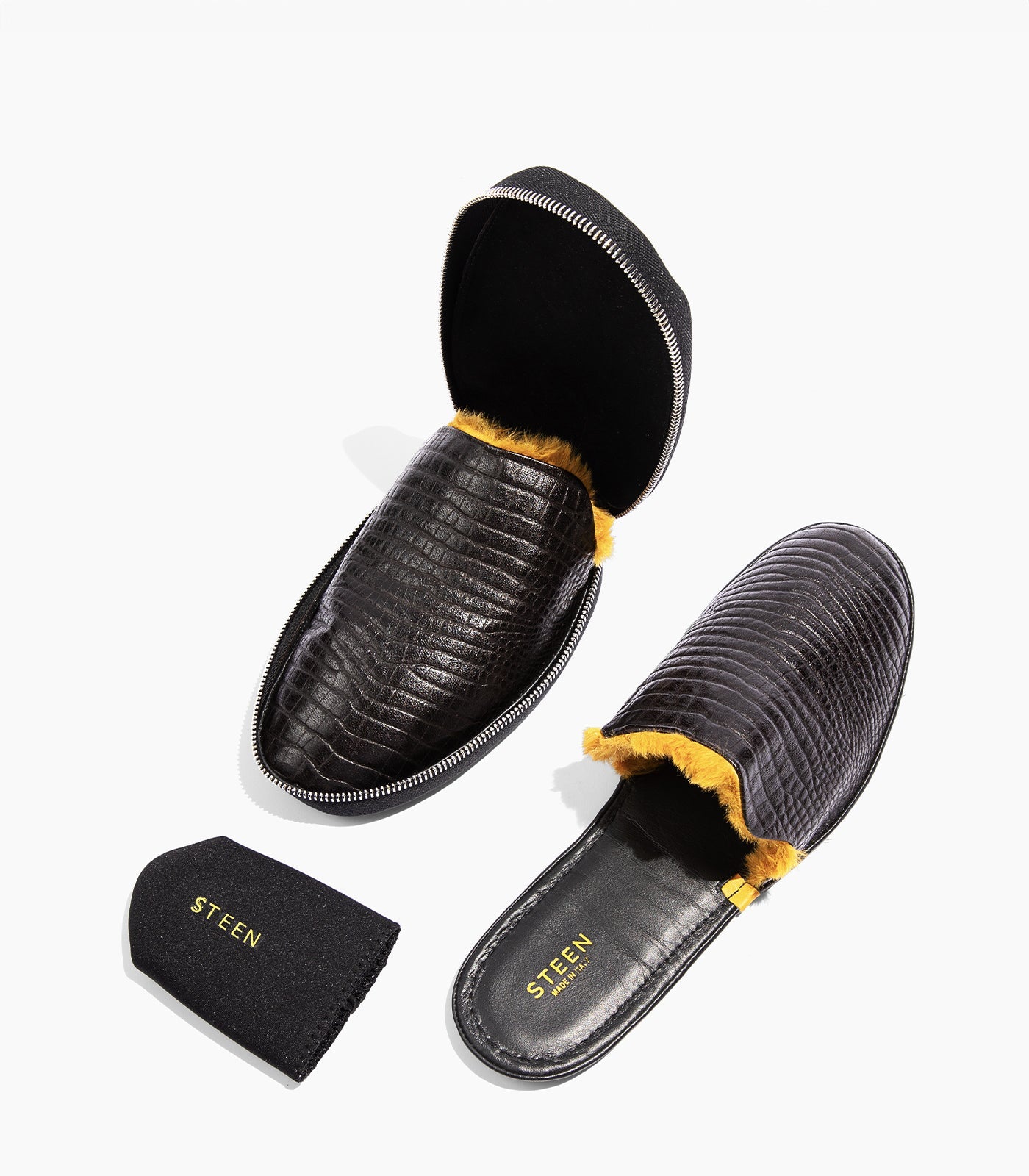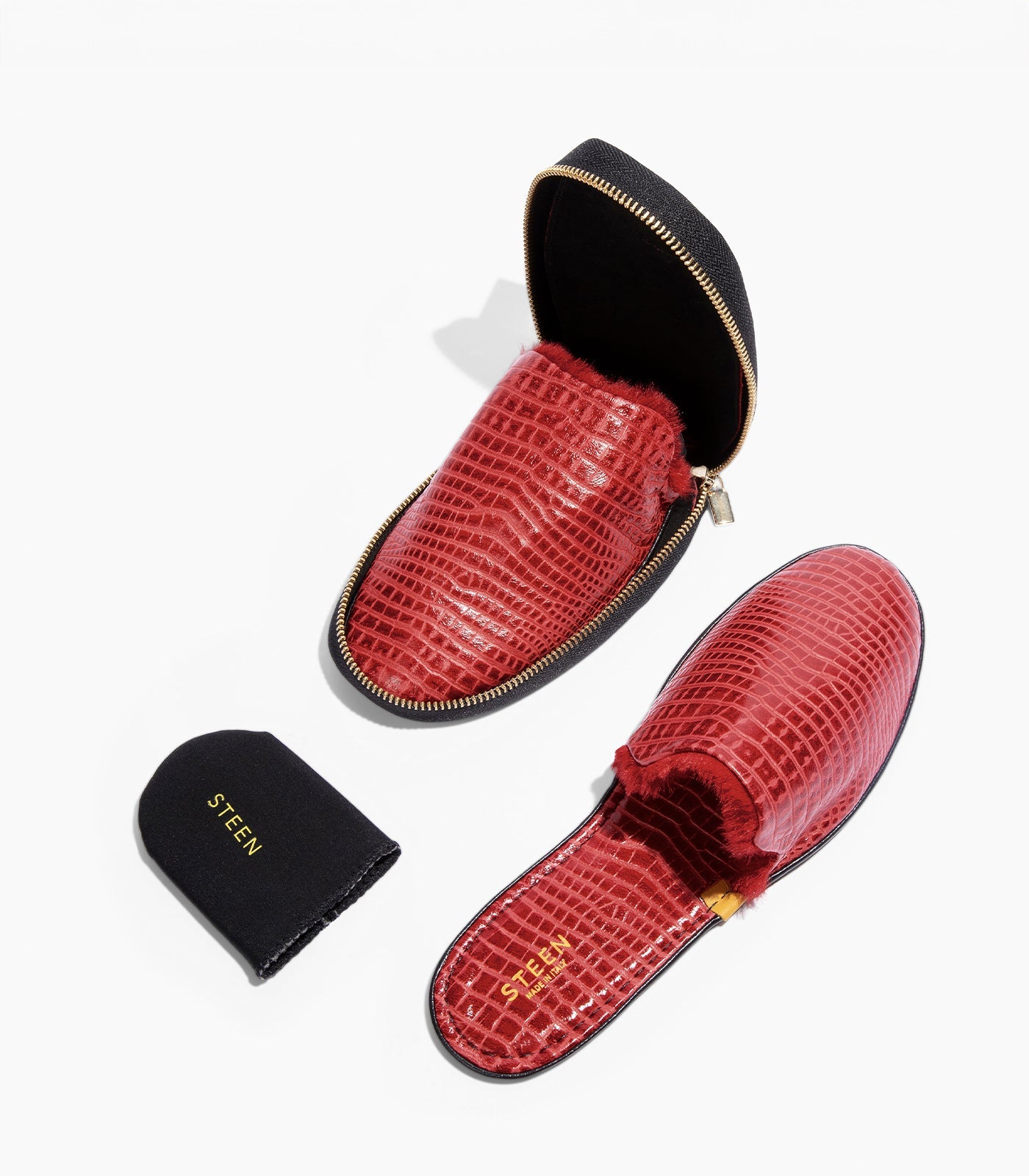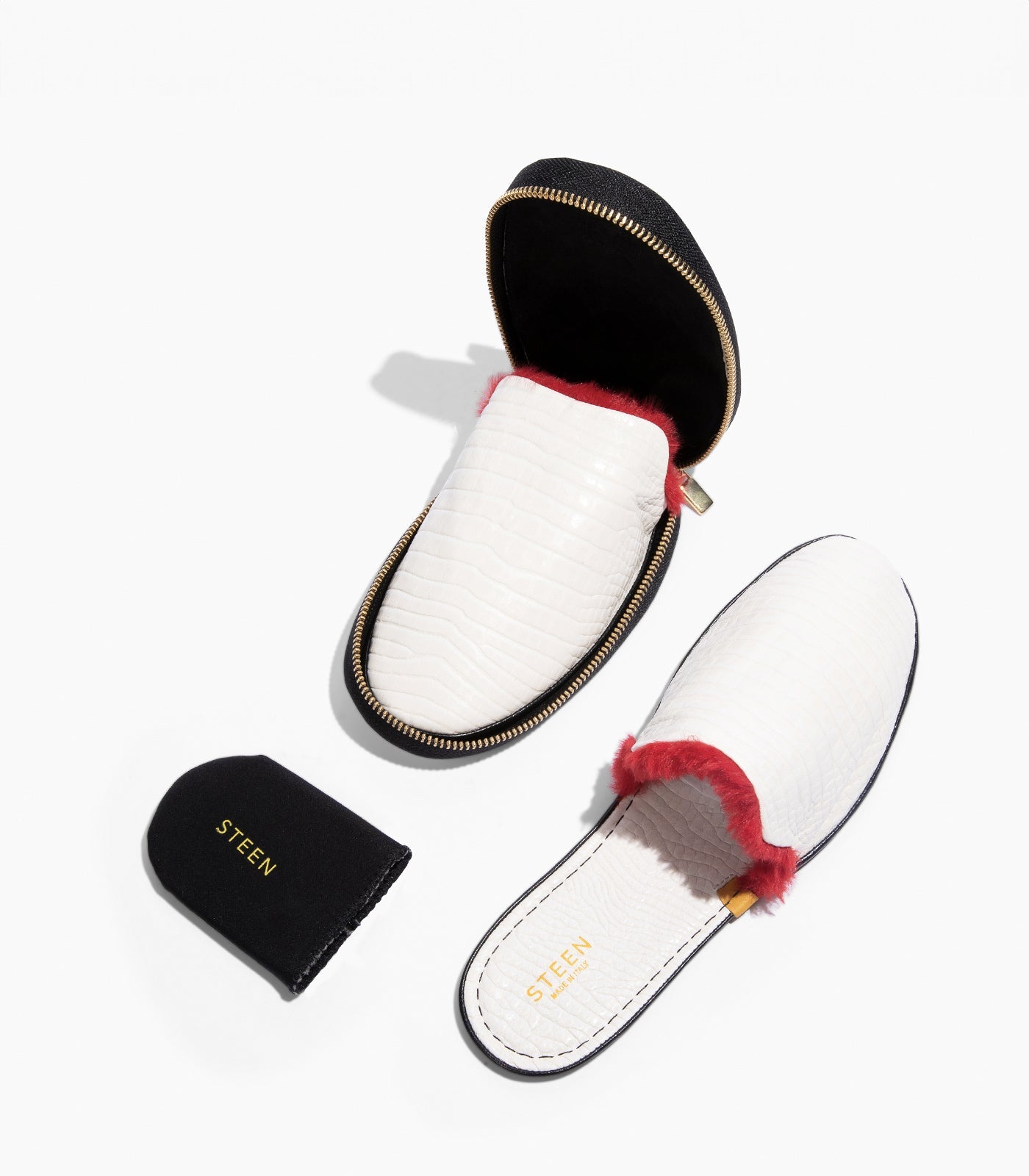 Steigern Sie Ihren Komfort mit den luxuriösen faltbaren Hausschuhen von STEEN, die in Italien fachmännisch handgefertigt werden, aus hochwertigem Nappa-Schaffellleder mit Ziegenlederfutter. Diese schicken, minimalistischen Hausschuhe lassen sich problemlos von zu Hause auf Reisen tragen. Sie haben eine weiche, flache Sohle und ein kompaktes Design, das in einen eleganten Reißverschlussbeutel passt. Mit dem Futter aus synthetischem Ökofell, das sich an Temperaturschwankungen anpasst, bleiben Ihre Füße in jedem Klima bequem.