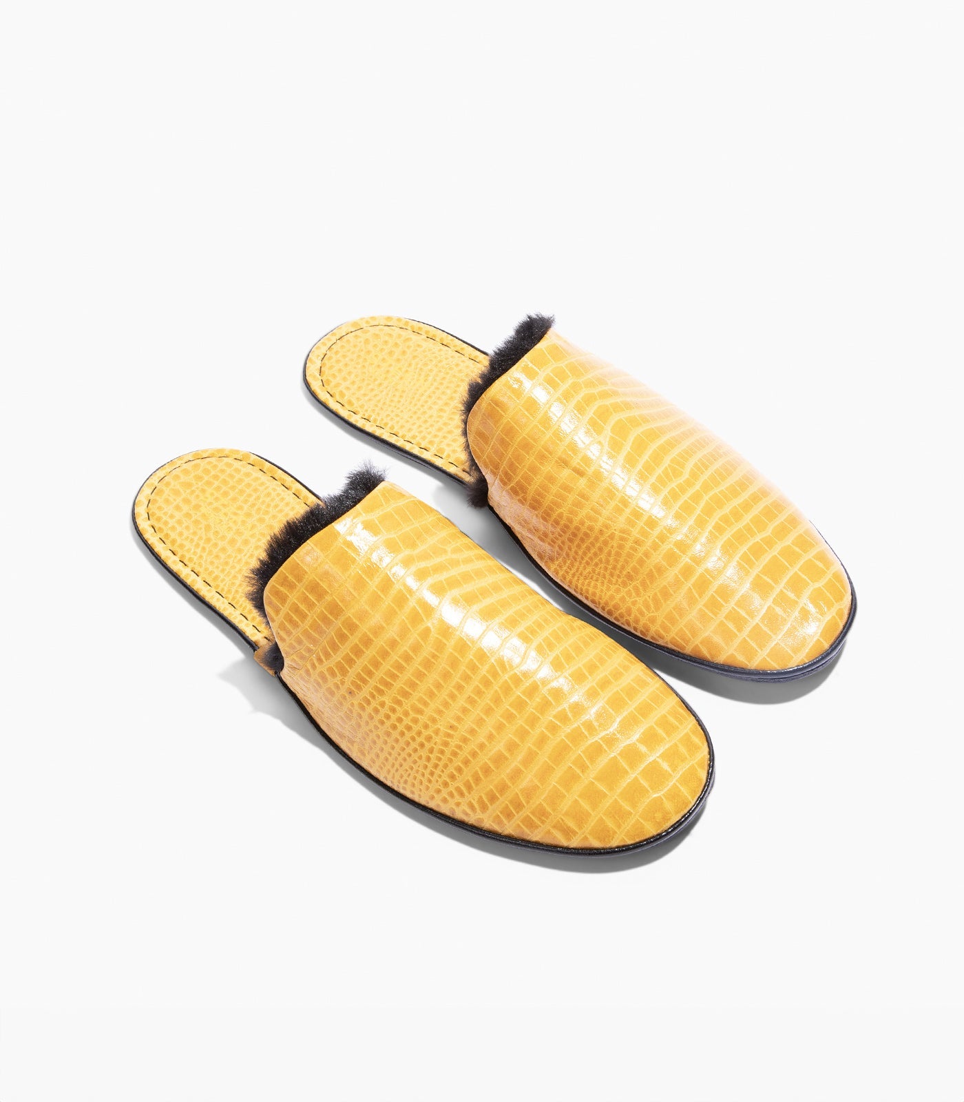 Faltbare Hausschuhe aus Leder mit Krokodilprägung und Öko-Pelz für Damen